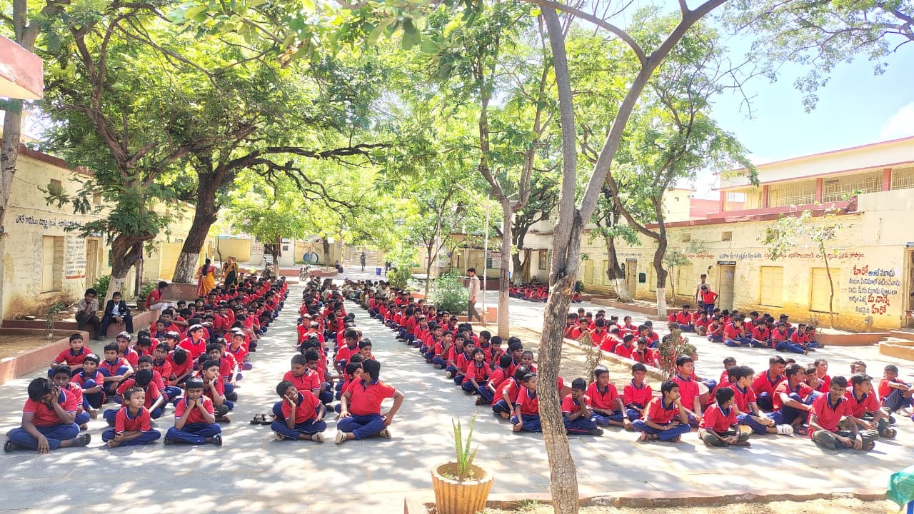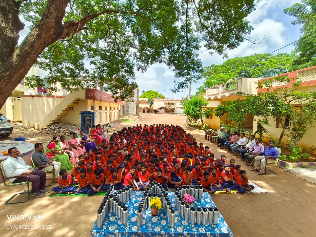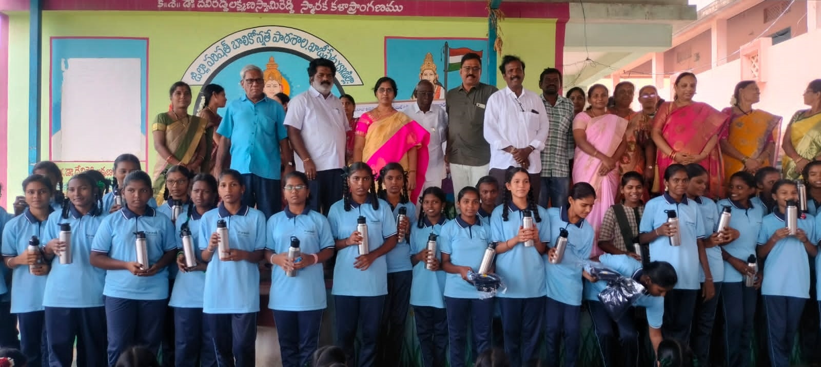 KAC Trust (Kamaraju Annapurnama Charitable Trust) distributed water bottles to students at Khazipet ZP High School to promote health and hydration.